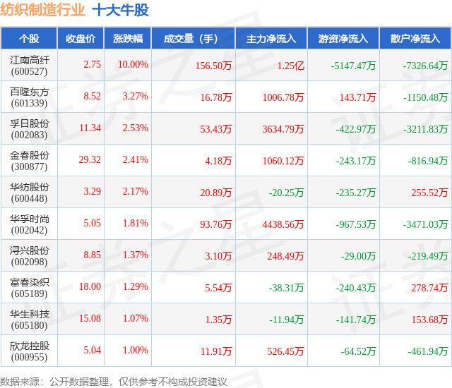 个股表现方面,纺织制造行业当日领涨股为江南高纤(600527),该股当日报收2.75,上涨10.0%,成交量156.5万,主力资金净流入1.25亿元。百隆东方(601339)以上涨3.27%紧随其后,该股当日成交量16.78万,主力资金净流入1006.78万元。除此之外,孚日股份(002083)、金春股份(300877)、华纺股份(600448)均进入当日牛股之列。具体个股列表见下表: