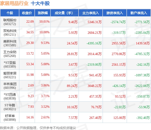 个股表现方面,家居用品行业当日领涨股为联翔股份(603272),该股当日报收22.09,上涨10.01%,成交量9.4万,主力资金净流入5346.31万元。双枪科技(001211)以上涨10.0%紧随其后,该股当日成交量5.93万,主力资金净流入2604.21万元。除此之外,美新科技(301588)、王力安防(605268)、*ST亚振(603389)均进入当日牛股之列。具体个股列表见下表: