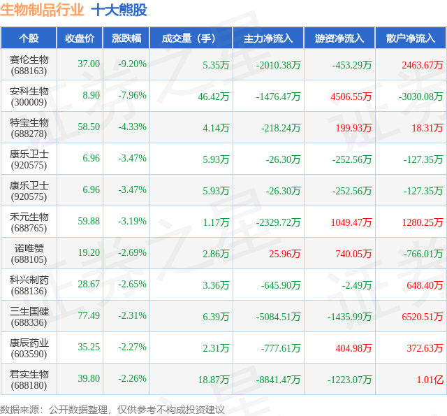 个股表现方面,生物制品行业当日领跌股为赛伦生物(688163),该股当日报收37.0,下跌9.2%,成交量5.35万,主力资金净流出2010.38万元。安科生物(300009)以下跌7.96%紧随其后,该股当日成交量46.42万,主力资金净流出1476.47万元。除此之外,特宝生物(688278)、康乐卫士(920575)、康乐卫士(920575)均进入当日熊股之列。具体个股列表见下表: