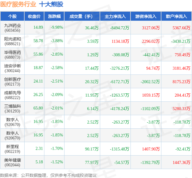 个股表现方面,医疗服务行业当日领跌股为九洲药业(603456),该股当日报收14.89,下跌9.98%,成交量36.46万,主力资金净流出8494.72万元。阳光诺和(688621)以下跌3.88%紧随其后,该股当日成交量3.59万,主力资金净流入1134.18万元。除此之外,毕得医药(688073)、迪安诊断(300244)、创新医疗(002173)均进入当日熊股之列。具体个股列表见下表:
