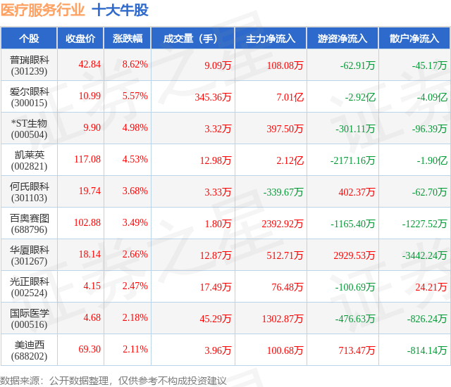 个股表现方面,医疗服务行业当日领涨股为普瑞眼科(301239),该股当日报收42.84,上涨8.62%,成交量9.09万,主力资金净流入108.08万元。爱尔眼科(300015)以上涨5.57%紧随其后,该股当日成交量345.36万,主力资金净流入7.01亿元。除此之外,*ST生物(000504)、凯莱英(002821)、何氏眼科(301103)均进入当日牛股之列。具体个股列表见下表: