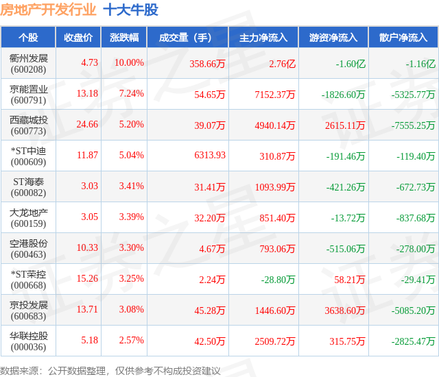 个股表现方面,房地产开发行业当日领涨股为衢州发展(600208),该股当日报收4.73,上涨10.0%,成交量358.66万,主力资金净流入2.76亿元。京能置业(600791)以上涨7.24%紧随其后,该股当日成交量54.65万,主力资金净流入7152.37万元。除此之外,西藏城投(600773)、*ST中迪(000609)、ST海泰(600082)均进入当日牛股之列。具体个股列表见下表: