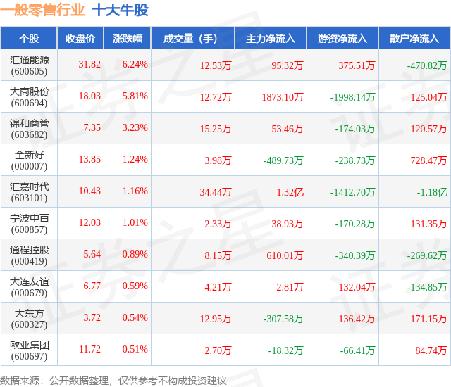 个股表现方面,一般零售行业当日领涨股为汇通能源(600605),该股当日报收31.82,上涨6.24%,成交量12.53万,主力资金净流入95.32万元。大商股份(600694)以上涨5.81%紧随其后,该股当日成交量12.72万,主力资金净流入1873.1万元。除此之外,锦和商管(603682)、全新好(000007)、汇嘉时代(603101)均进入当日牛股之列。具体个股列表见下表: