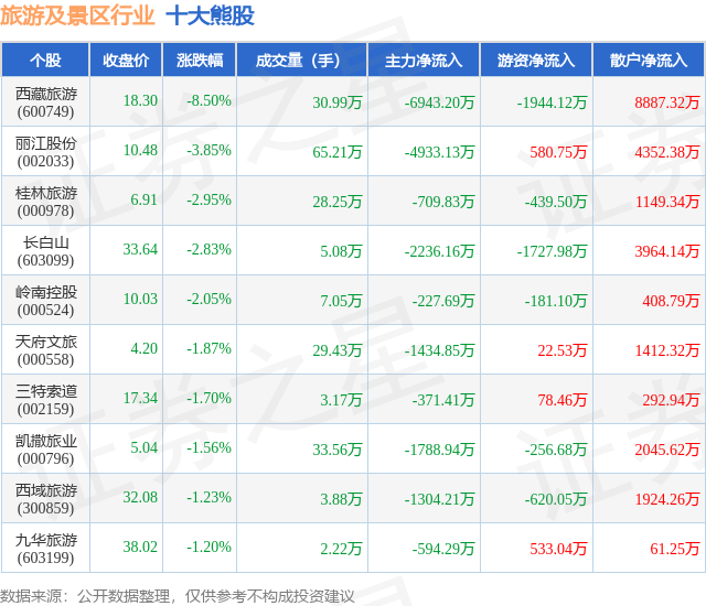 个股表现方面,旅游及景区行业当日领跌股为西藏旅游(600749),该股当日报收18.3,下跌8.5%,成交量30.99万,主力资金净流出6943.2万元。丽江股份(002033)以下跌3.85%紧随其后,该股当日成交量65.21万,主力资金净流出4933.13万元。除此之外,桂林旅游(000978)、长白山(603099)、岭南控股(000524)均进入当日熊股之列。具体个股列表见下表: