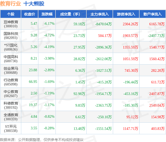 个股表现方面,教育行业当日领跌股为豆神教育(300010),该股当日报收5.47,下跌6.17%,成交量59.18万,主力资金净流出8470.04万元。国脉科技(002093)以下跌4.72%紧随其后,该股当日成交量23.73万,主力资金净流入504.17万元。除此之外,*ST国化(600636)、中国高科(600730)、创业黑马(300688)均进入当日熊股之列。具体个股列表见下表: