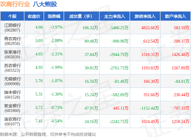 个股表现方面,农商行行业当日领跌股为江阴银行(002807),该股当日报收4.6,下跌3.97%,成交量106.32万,主力资金净流出5406.25万元。青农商行(002958)以下跌2.88%紧随其后,该股当日成交量80.48万,主力资金净流出900.9万元。除此之外,张家港行(002839)、苏农银行(603323)、无锡银行(600908)均进入当日熊股之列。具体个股列表见下表: