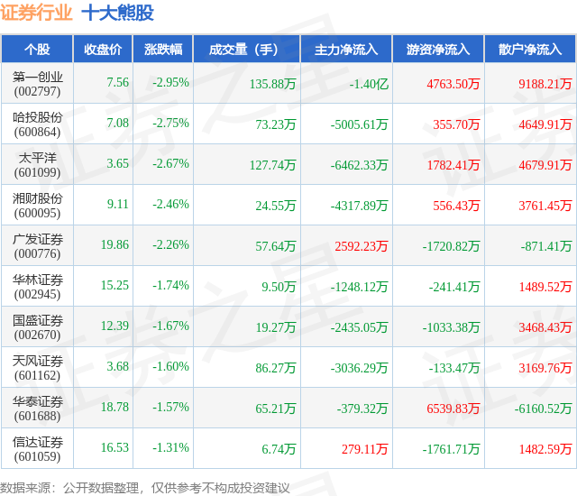 个股表现方面,证券行业当日领跌股为第一创业(002797),该股当日报收7.56,下跌2.95%,成交量135.88万,主力资金净流出1.4亿元。哈投股份(600864)以下跌2.75%紧随其后,该股当日成交量73.23万,主力资金净流出5005.61万元。除此之外,太平洋(601099)、湘财股份(600095)、广发证券(000776)均进入当日熊股之列。具体个股列表见下表: