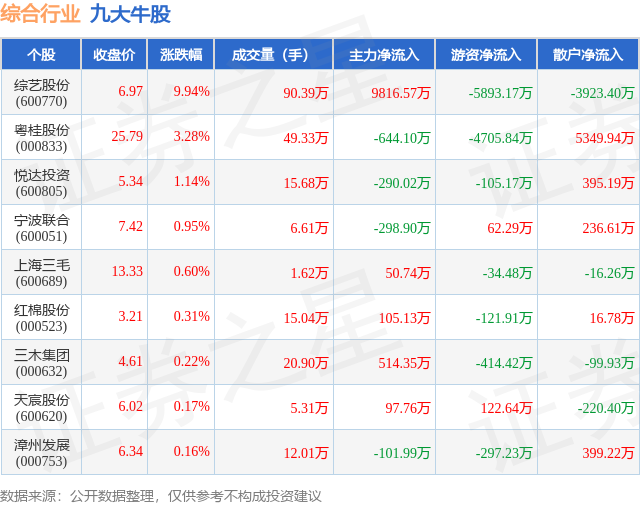 个股表现方面,综合行业当日领涨股为综艺股份(600770),该股当日报收6.97,上涨9.94%,成交量90.39万,主力资金净流入9816.57万元。粤桂股份(000833)以上涨3.28%紧随其后,该股当日成交量49.33万,主力资金净流出644.1万元。除此之外,悦达投资(600805)、宁波联合(600051)、上海三毛(600689)均进入当日牛股之列。具体个股列表见下表:
