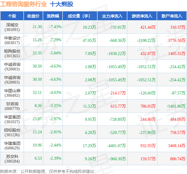 个股表现方面,工程咨询服务行业当日领跌股为深城交(301091),该股当日报收21.3,下跌7.43%,成交量10.23万,主力资金净流出731.81万元。中衡设计(603017)以下跌7.29%紧随其后,该股当日成交量47.05万,主力资金净流出668.36万元。除此之外,矩阵股份(301365)、中诚咨询(920003)、中诚咨询(920003)均进入当日熊股之列。具体个股列表见下表:
