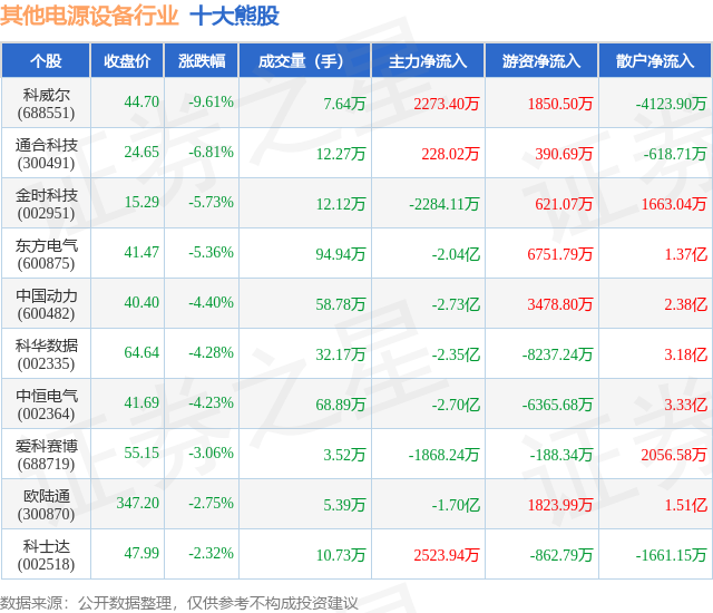 个股表现方面,其他电源设备行业当日领跌股为科威尔(688551),该股当日报收44.7,下跌9.61%,成交量7.64万,主力资金净流入2273.4万元。通合科技(300491)以下跌6.81%紧随其后,该股当日成交量12.27万,主力资金净流入228.02万元。除此之外,金时科技(002951)、东方电气(600875)、中国动力(600482)均进入当日熊股之列。具体个股列表见下表: