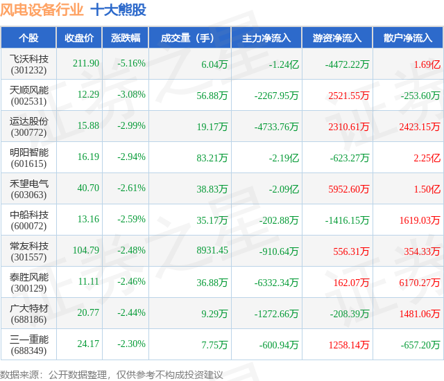 个股表现方面,风电设备行业当日领跌股为飞沃科技(301232),该股当日报收211.9,下跌5.16%,成交量6.04万,主力资金净流出1.24亿元。天顺风能(002531)以下跌3.08%紧随其后,该股当日成交量56.88万,主力资金净流出2267.95万元。除此之外,运达股份(300772)、明阳智能(601615)、禾望电气(603063)均进入当日熊股之列。具体个股列表见下表: