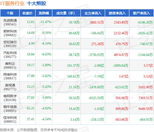 个股表现方面,IT服务行业当日领跌股为先进数通(300541),该股当日报收12.81,下跌11.47%,成交量39.78万,主力资金净流入3802.31万元。朗新科技(300682)以下跌9.16%紧随其后,该股当日成交量49.68万,主力资金净流出106.04万元。除此之外,世纪瑞尔(300150)、汽轮科技(300277)、美利云(000815)均进入当日熊股之列。具体个股列表见下表: