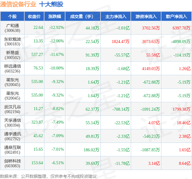 个股表现方面,通信设备行业当日领跌股为广和通(300638),该股当日报收22.64,下跌12.92%,成交量44.18万,主力资金净流出1.01亿元。东软载波(300183)以下跌12.06%紧随其后,该股当日成交量22.54万,主力资金净流入1824.47万元。除此之外,新易盛(300502)、移远通信(603236)、蘅东光(920045)均进入当日熊股之列。具体个股列表见下表: