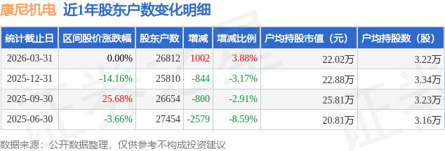 从股价来看,2025年12月31日至2026年3月31日,康尼机电区间跌幅为0.0%,在此期间股东户数增加1002.0户,增幅为3.88%。