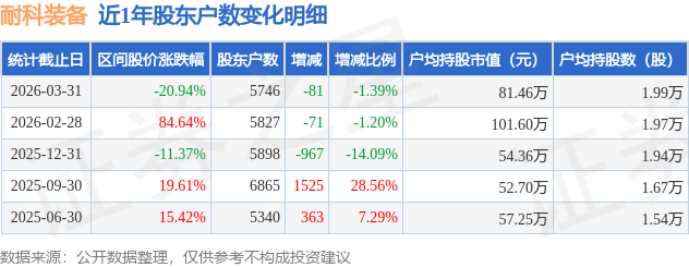 证券之星消息,近日耐科装备披露,截至2026年3月31日公司股东户数为5746.0户,较2月28日减少81.0户,减幅为1.39%。户均持股数量由上期的1.97万股增加至1.99万股,户均持股市值为81.46万元。