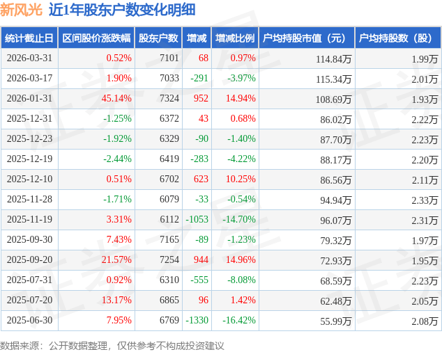 证券之星消息,近日新风光披露,截至2026年3月31日公司股东户数为7101.0户,较3月17日增加68.0户,增幅为0.97%。户均持股数量由上期的2.01万股减少至1.99万股,户均持股市值为114.84万元。
