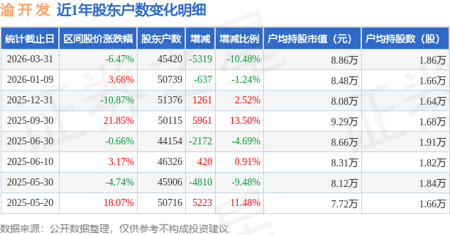 从股价来看,2026年1月9日至2026年3月31日,渝 开 发区间跌幅为6.47%,在此期间股东户数减少5319.0户,减幅为10.48%。