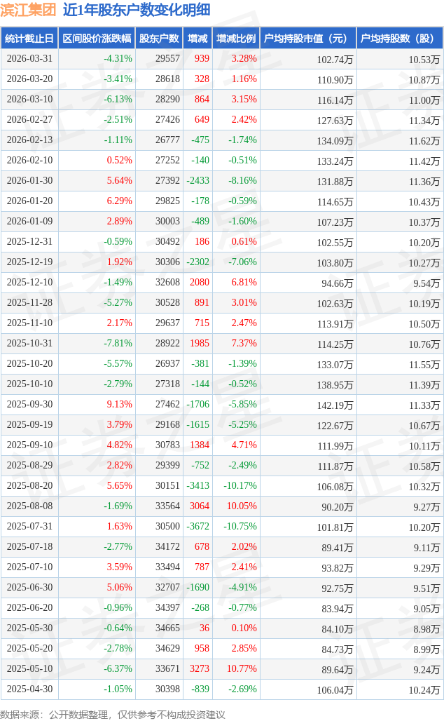 从股价来看,2026年3月20日至2026年3月31日,滨江集团区间跌幅为4.31%,在此期间股东户数增加939.0户,增幅为3.28%。