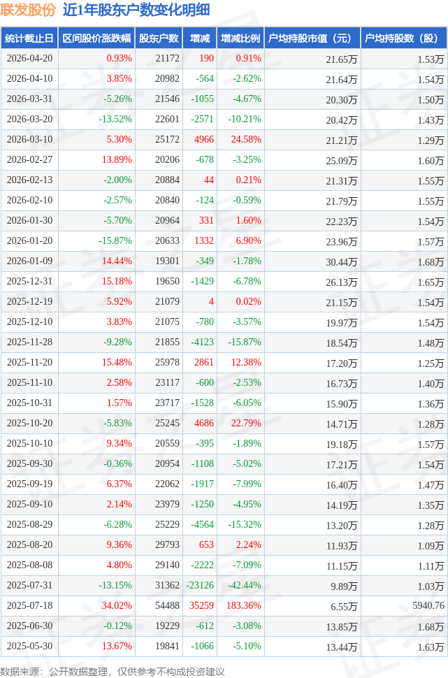 从股价来看,2026年4月10日至2026年4月20日,联发股份区间涨幅为0.93%,在此期间股东户数增加190.0户,增幅为0.91%。