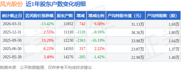 从股价来看,2025年12月31日至2026年3月31日,风光股份区间跌幅为13.42%,在此期间股东户数增加742.0户,增幅为6.68%。