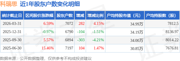 证券之星消息,近日科瑞思披露,截至2026年3月31日公司股东户数为7072.0户,较12月31日增加282.0户,增幅为4.15%。户均持股数量由上期的8137.0股减少至7812.0股,户均持股市值为34.99万元。