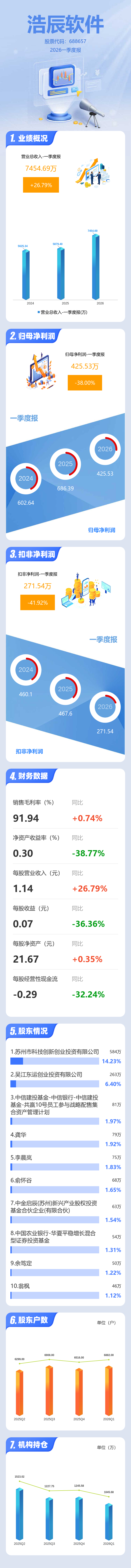 证券之星消息,浩辰软件2026年一季报显示,一季度公司主营收入7454.69万元,同比上升26.79%;归母净利润425.53万元,同比下降38.0%;扣非净利润271.54万元,同比下降41.93%;负债率6.93%,投资收益114.34万元,财务费用176.22万元,毛利率91.94%。
