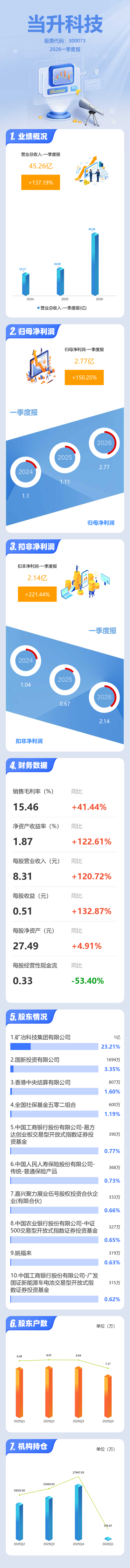 证券之星消息,当升科技2026年一季报显示,一季度公司主营收入45.26亿元,同比上升137.19%;归母净利润2.77亿元,同比上升150.25%;扣非净利润2.14亿元,同比上升221.45%;负债率36.1%,投资收益262.31万元,财务费用5218.54万元,毛利率15.46%。