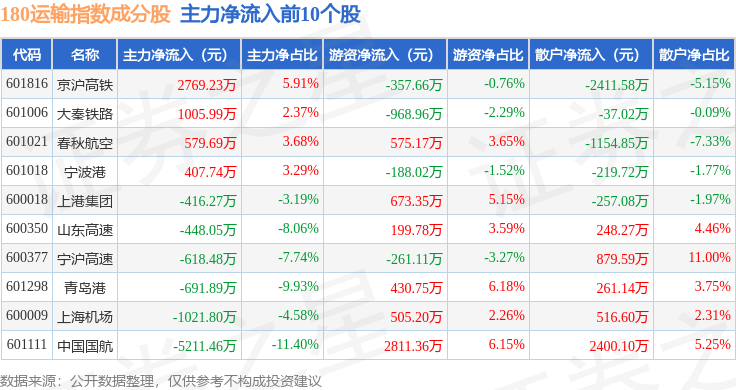 资金流向方面,180运输(000027)指数成份股当日主力资金净流出合计4.2亿元,游资资金净流入合计1.74亿元,散户资金净流入合计2.46亿元。成份股资金流向详情见下表:
