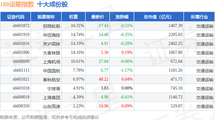 180运输(000027)指数十大成份股详情如下: