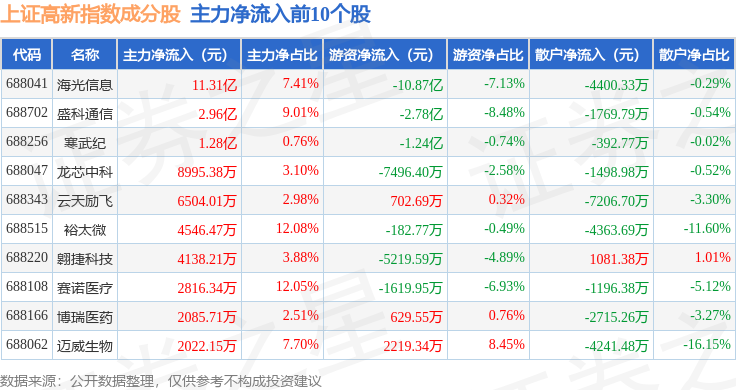 资金流向方面,上证高新(000131)指数成份股当日主力资金净流入合计2.66亿元,游资资金净流出合计4.15亿元,散户资金净流入合计1.5亿元。成份股资金流向详情见下表: