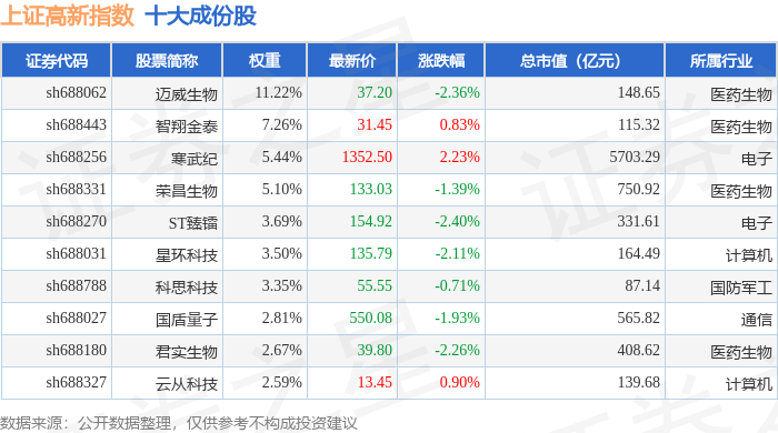 上证高新(000131)指数十大成份股详情如下:
