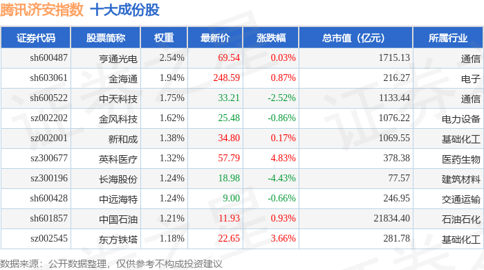 腾讯济安(000847)指数十大成份股详情如下: