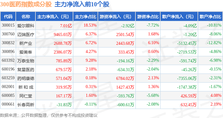资金流向方面,300医药(000913)指数成份股当日主力资金净流入合计4.64亿元,游资资金净流出合计4634.0万元,散户资金净流出合计4.17亿元。成份股资金流向详情见下表: