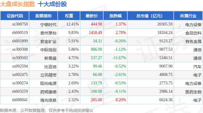 证券之星消息,4月24日,大盘成长(399372)指数报收于5619.72点,跌0.34%,成交2909.88亿元,换手率0.79%。当日该指数成份股中,上涨的有19家,海光信息以8.2%的涨幅领涨,下跌的有45家,新易盛以11.67%的跌幅领跌。