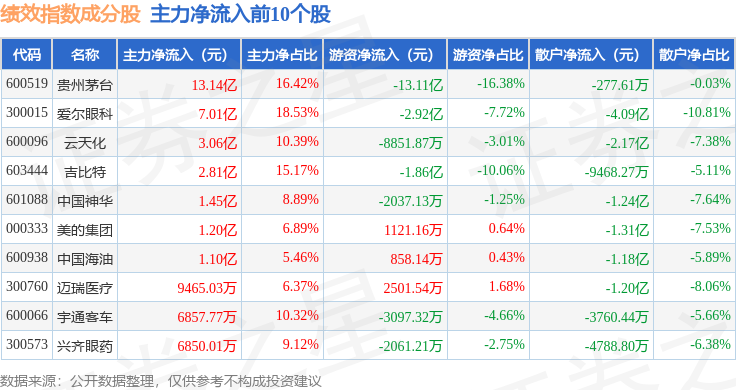 资金流向方面,绩效指数(399398)成份股当日主力资金净流出合计5.03亿元,游资资金净流出合计7.6亿元,散户资金净流入合计12.63亿元。成份股资金流向详情见下表: