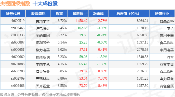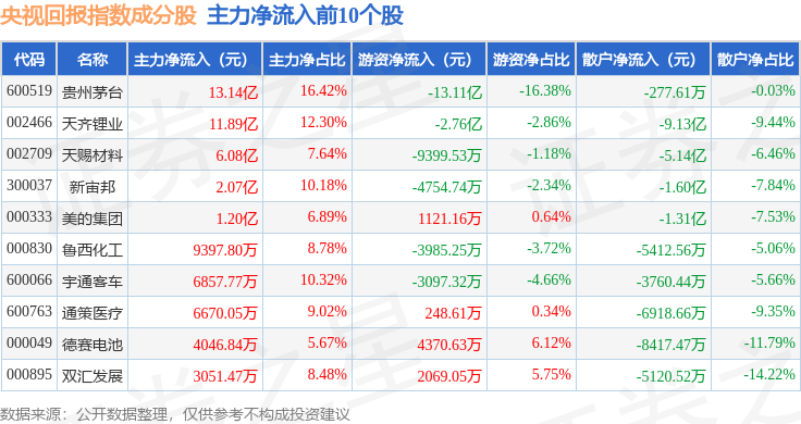 资金流向方面,央视回报(399553)指数成份股当日主力资金净流入合计14.05亿元,游资资金净流出合计12.23亿元,散户资金净流出合计1.82亿元。成份股资金流向详情见下表: