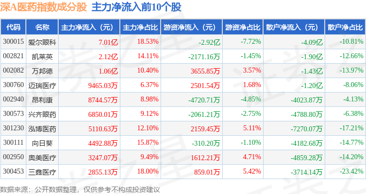 资金流向方面,深A医药(399674)指数成份股当日主力资金净流出合计3035.17万元,游资资金净流出合计4514.85万元,散户资金净流入合计7550.02万元。成份股资金流向详情见下表: