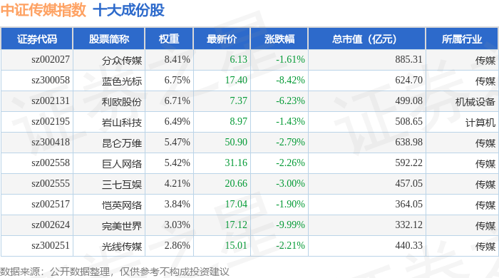 中证传媒(399971)指数十大成份股详情如下: