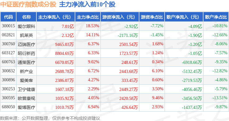 资金流向方面,中证医疗(399989)指数成份股当日主力资金净流入合计4.38亿元,游资资金净流入合计47.76万元,散户资金净流出合计4.43亿元。成份股资金流向详情见下表: