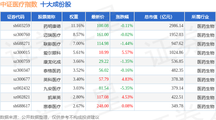 证券之星消息,4月24日,中证医疗(399989)指数报收于6674.66点,跌0.16%,成交270.94亿元,换手率2.51%。当日该指数成份股中,上涨的有17家,爱尔眼科以5.57%的涨幅领涨,下跌的有33家,九洲药业以9.98%的跌幅领跌。