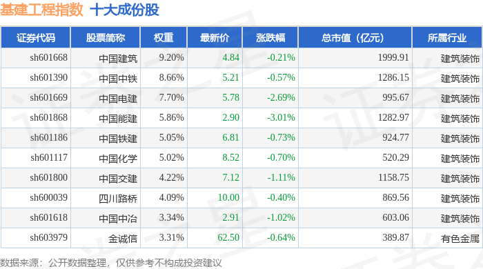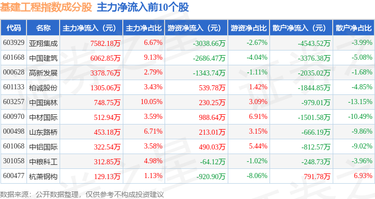 资金流向方面,基建工程(399995)指数成份股当日主力资金净流出合计19.23亿元,游资资金净流入合计3.39亿元,散户资金净流入合计15.84亿元。成份股资金流向详情见下表: