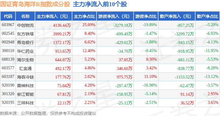 资金流向方面,国证青岛海洋R(480532)指数成份股当日主力资金净流出合计2.11亿元,游资资金净流出合计6396.54万元,散户资金净流入合计2.73亿元。成份股资金流向详情见下表: