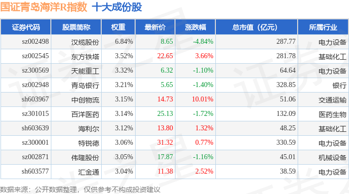 国证青岛海洋R(480532)指数十大成份股详情如下: