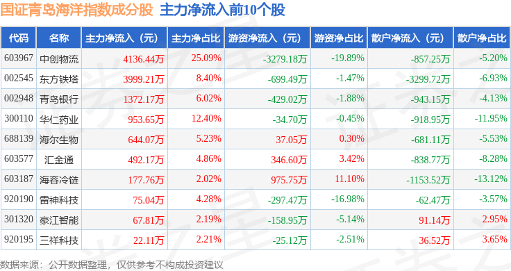 资金流向方面,国证青岛海洋(980532)指数成份股当日主力资金净流出合计2.11亿元,游资资金净流出合计6396.54万元,散户资金净流入合计2.73亿元。成份股资金流向详情见下表: