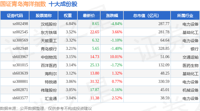 国证青岛海洋(980532)指数十大成份股详情如下: