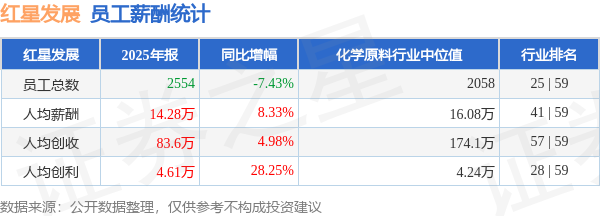 证券之星消息,4月25日红星发展公布2025年年报,当年营收21.35亿元,同比减2.82%;净利润为9282.97万元,同比增4.21%。根据财报数据披露,当年公司员工总数2554人,同比减7.43%;人均薪酬14.28万元,同比增8.33%;人均创收83.6万元,同比增4.98%;人均创利4.61万元,同比增28.25%;公司员工薪酬统计见下表: