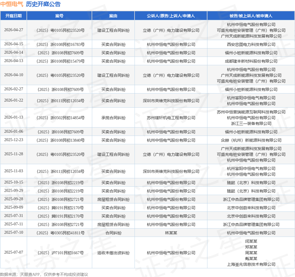 案号:(2025)粤0105民初23520号根据统计,近一年内以杭州中恒电气股份有限公司为当事人的历史开庭公告有21则,其中案由为“买卖合同纠纷”的公告以13则居首,其次为“建设工程合同纠纷”有3则,“房屋租赁合同纠纷”有2则。历史开庭公告(前20条)如下: