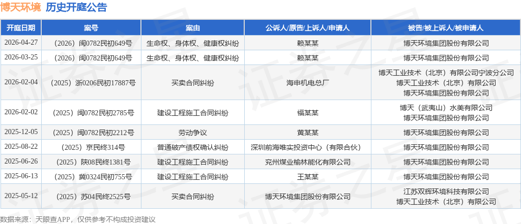 案号:(2026)闽0782民初649号根据统计,近一年内以博天环境集团股份有限公司为当事人的历史开庭公告有9则,其中案由为“建设工程施工合同纠纷”的公告以3则居首,其次为“买卖合同纠纷”有2则,“生命权、身体权、健康权纠纷”有2则。历史开庭公告如下: