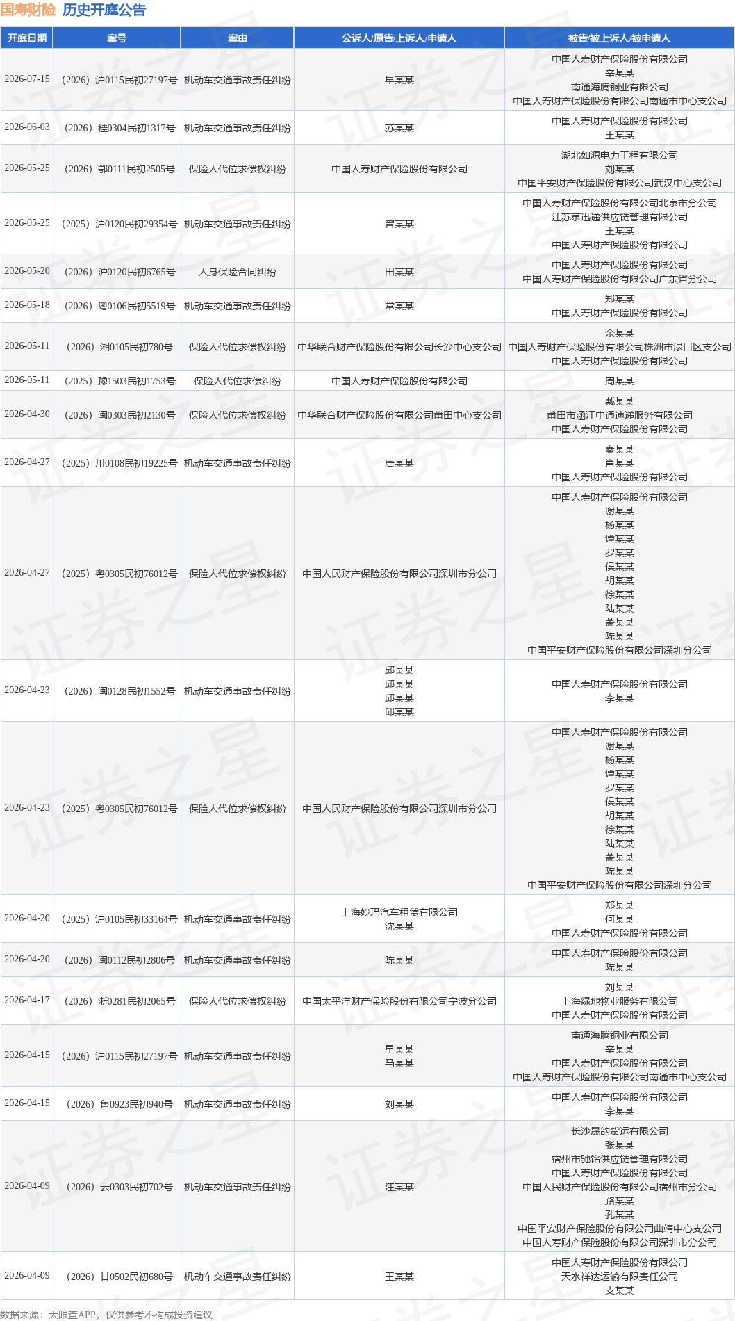 案号:(2025)川0108民初19225号根据统计,近一年内以中国人寿财产保险股份有限公司为当事人的历史开庭公告有297则,其中案由为“机动车交通事故责任纠纷”的公告以189则居首,其次为“保险人代位求偿权纠纷”有44则,“保险纠纷”有9则。历史开庭公告(前20条)如下: