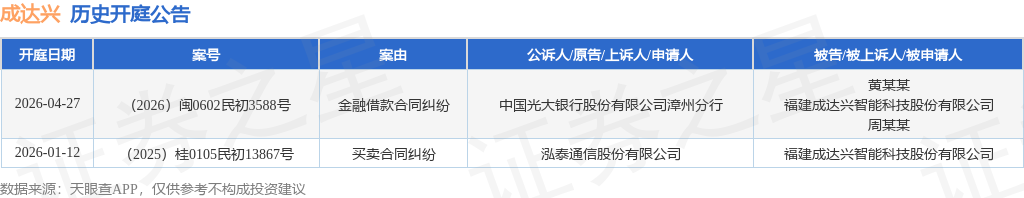 根据统计,近一年内以福建成达兴智能科技股份有限公司为当事人的历史开庭公告有2则,其中案由为“买卖合同纠纷”的公告以1则居首,其次为“金融借款合同纠纷”有1则。历史开庭公告如下: